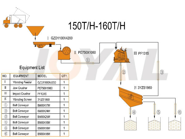 www.17.com礦機(jī)的150-160TPH 鄂破/反擊破(pò)整套石料生產設備主要由GZD1100X4200振動給料機、一級破碎PE750X1060顎式破碎機、二級破碎PF1315反擊式破碎機、3YZS1860振動篩和配套膠帶輸送機、電控(kòng)係統等組成(chéng)。可對石灰石、大理石、花崗岩、玄武岩、河卵石等物料進行破碎、篩分,生產多種粒度級別的建設用砂(shā)石料。可根據客戶對石料規格、產量、石料用(yòng)途的要求,為客戶提供合理、經濟的設(shè)備配置方(fāng)案。