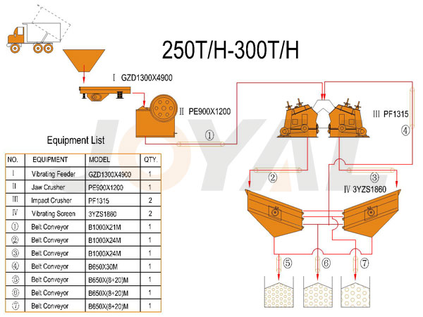 www.17.com礦機的250-300TPH 鄂破/反擊破整套石料生產設備主要由GZD1300X4900振動給料機、一級破碎PE900X1200顎式破碎機、二級破碎PF1315反擊式破碎機、3YZS1860振動篩和配套膠(jiāo)帶(dài)輸送機、電控係統等組成。可對石(shí)灰石、大理石、花崗(gǎng)岩、玄武岩、河卵石等物料進行破碎、篩分,生產多種粒度級別的建(jiàn)設用砂石料。可根據客戶對石料規格、產量、石料(liào)用途的(de)要(yào)求(qiú),為客戶提(tí)供合(hé)理、經濟的設備配置(zhì)方案。