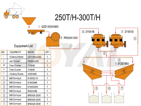 www.17.com礦機的250-300TPH 鄂(è)破/圓錐破整套石料生產設備主要由GZD1300X4900振動給料機、一級破碎PE900X1200顎式破碎機、二級破碎ZYS51"-B和ZYS51"-D圓錐式破碎機、3YZS1860振動篩和配套(tào)膠帶輸送機、電控係統等組成。可對石灰石、大理石、花崗岩、玄武岩(yán)、河卵石等物料(liào)進行破碎、篩分,生產多種粒度級(jí)別的建設用砂石料。可根據客戶對石料規格、產量、石料用(yòng)途的要(yào)求,為客戶提供合理、經濟的設備配置(zhì)方案。